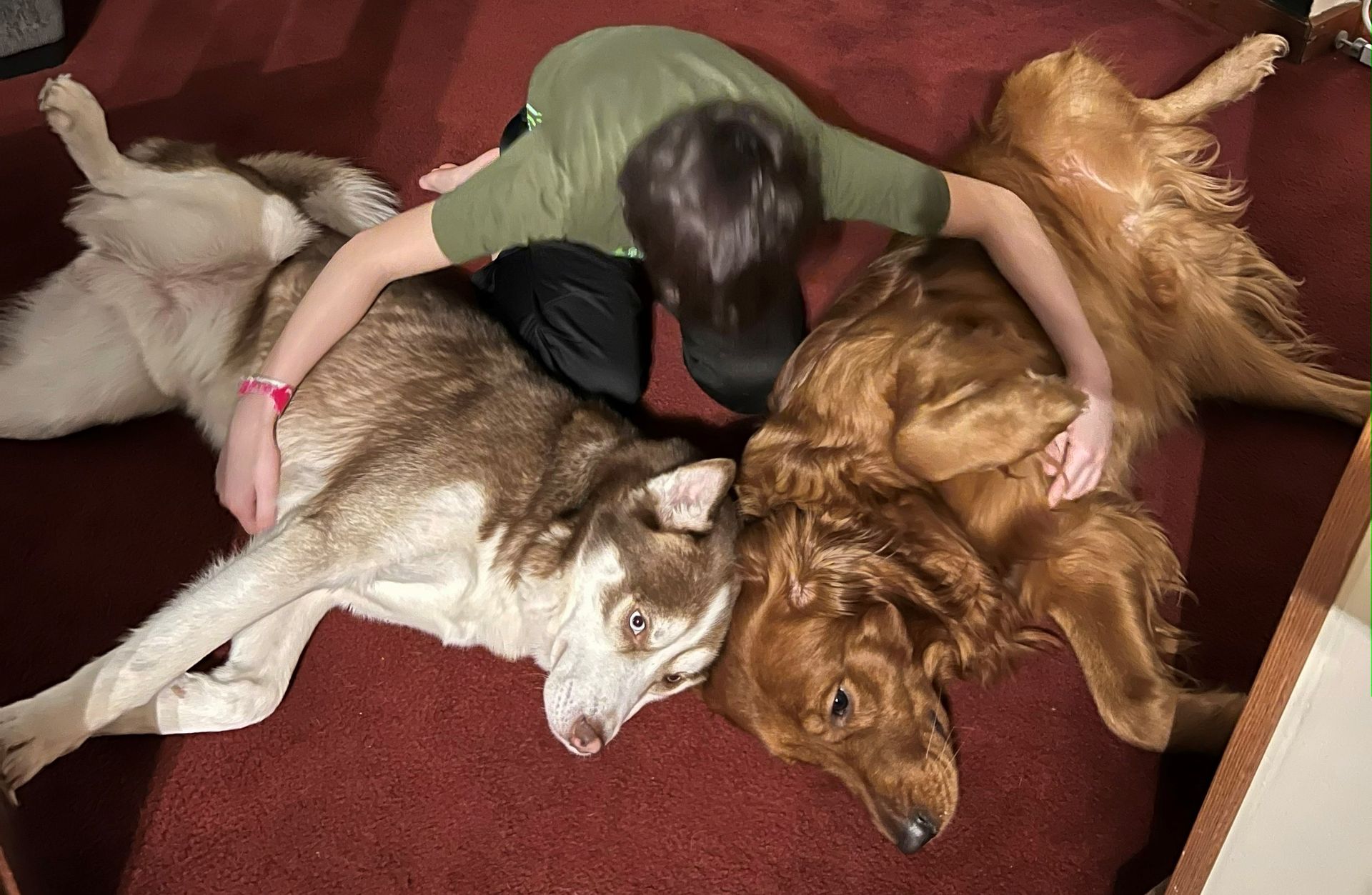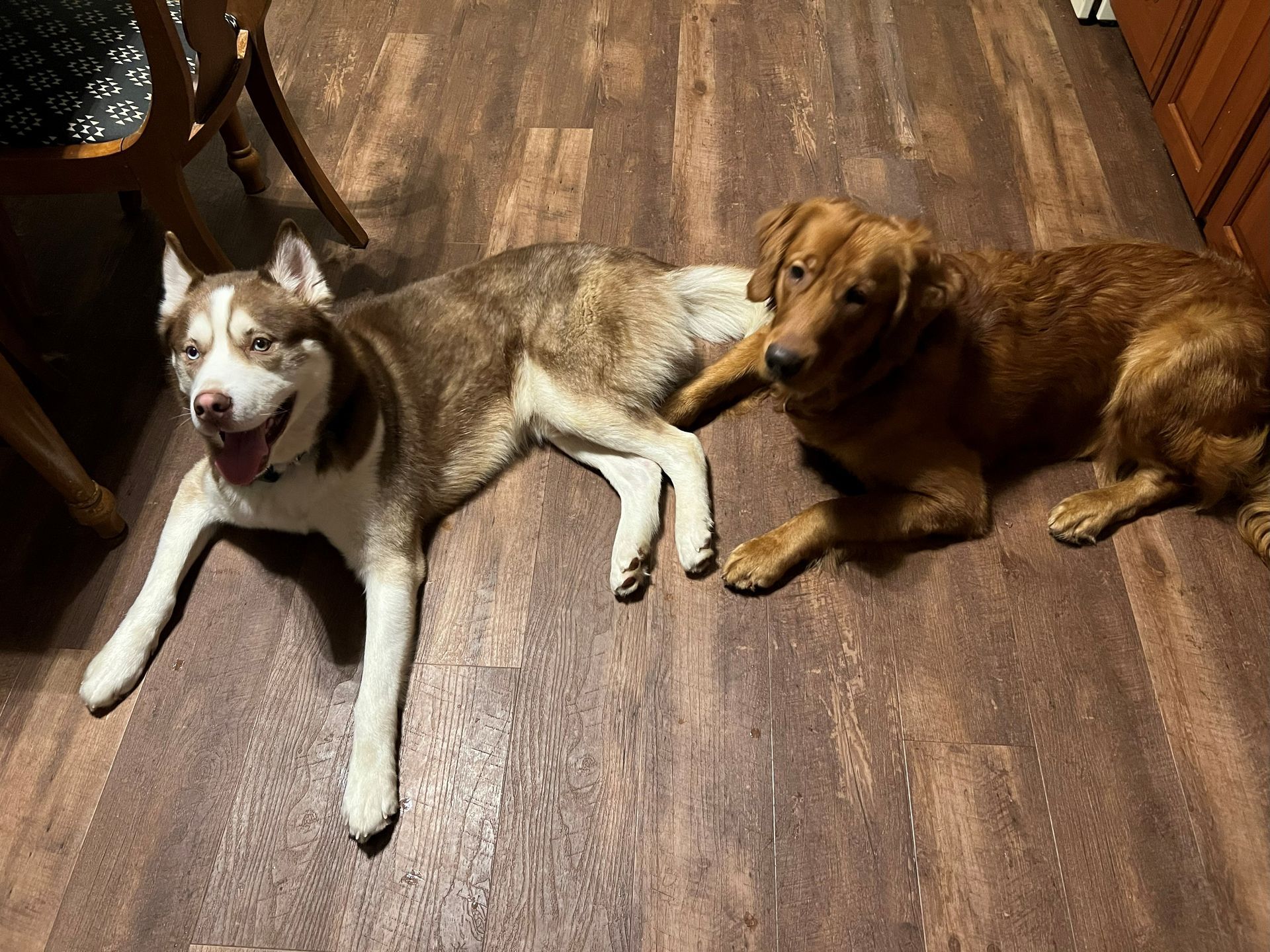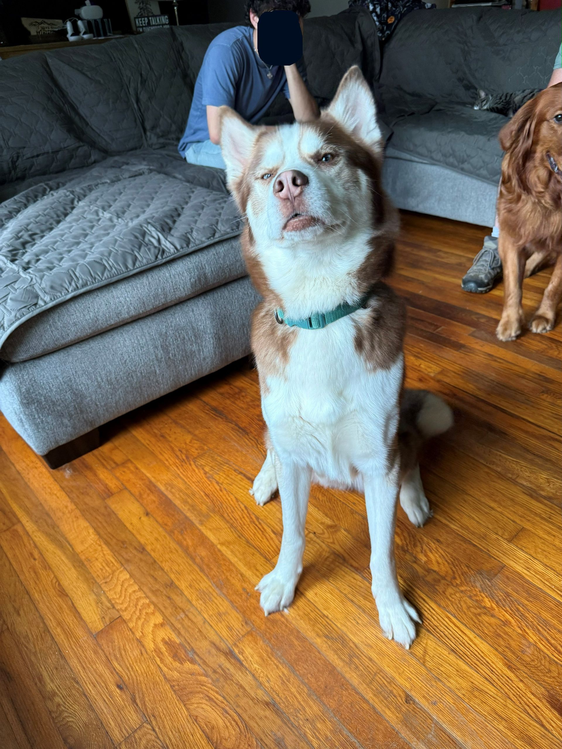 Odin does well with other dogs, cats, and children. He has lived in a busy household with multiple kids and another dog and has handled the activity and noise without stress. He is social, friendly, and easygoing. He is an opportunistic counter-surfer—his breed tendencies, paired with a history of inconsistent feeding before he came to us, means he still gets tempted if food is left unattended.