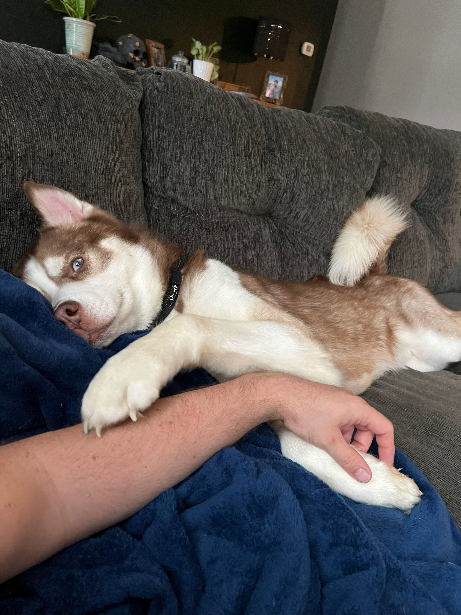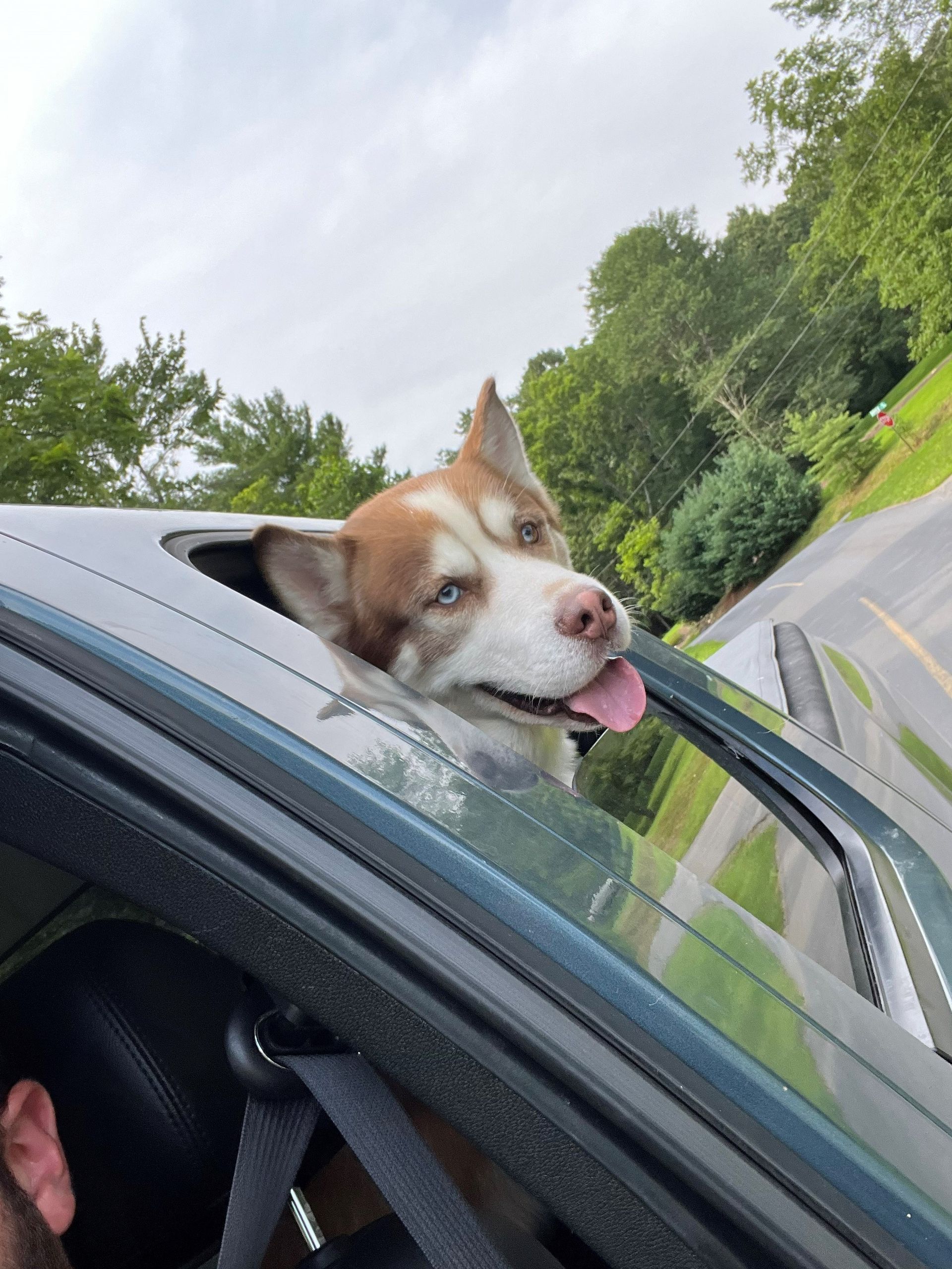 Meet Odin, a stunning 3.5-year-old brown Siberian Husky with warm orangish-brown and gray tones, classic white Husky markings, and an affectionate personality that wins everyone over. He weighs 68 pounds and is a friendly, gentle, medium-energy dog who loves people and thrives on companionship.